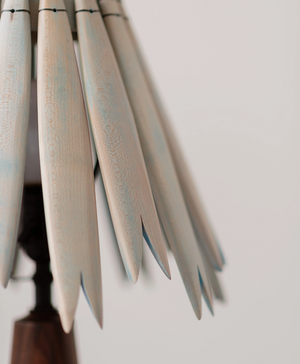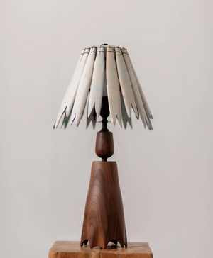 Bilobata IV Table Lamp is named for the tapered bilobate panels that make up its wooden shade, inspired by the bifid leaves of neotropical palms, cycads, and cyclanths.
