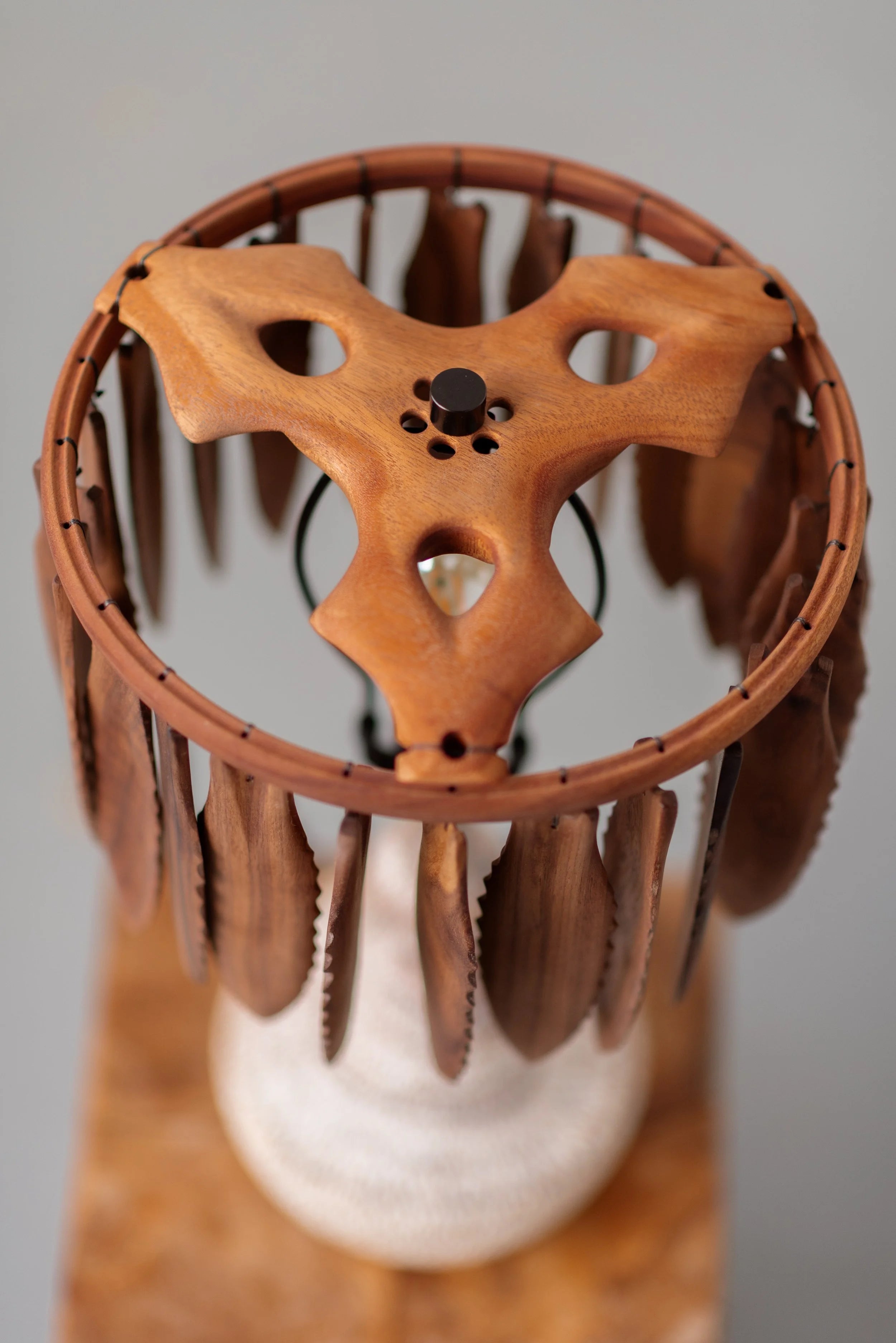 The body is split in two sections, and entirely covered in a texture of fissures and ridges. The wood that forms the body is local estate grown and felled coast redwood and salvaged valley oak.